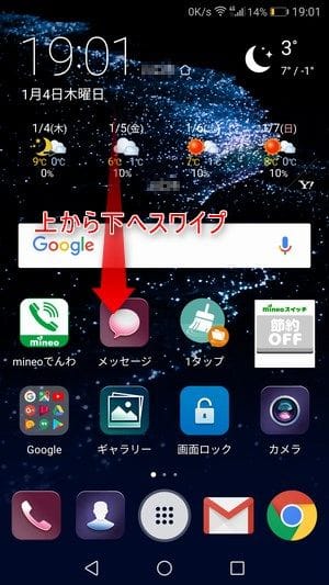ホーム画面まできてしまってからQRコードリーダーを起動するには、通知バー(ステータスバー)に指がかからないようにして上から下へスワイプします(ホーム画面じゃなくても大丈夫です)。