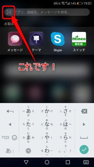 すると、上の画像のように「アプリ、連絡先、メッセージを検索…」の画面になるので「アプリ、連絡先、メッセージを検索…」の左にある四角いアイコンをタップするとQRコードリーダーが起動します。